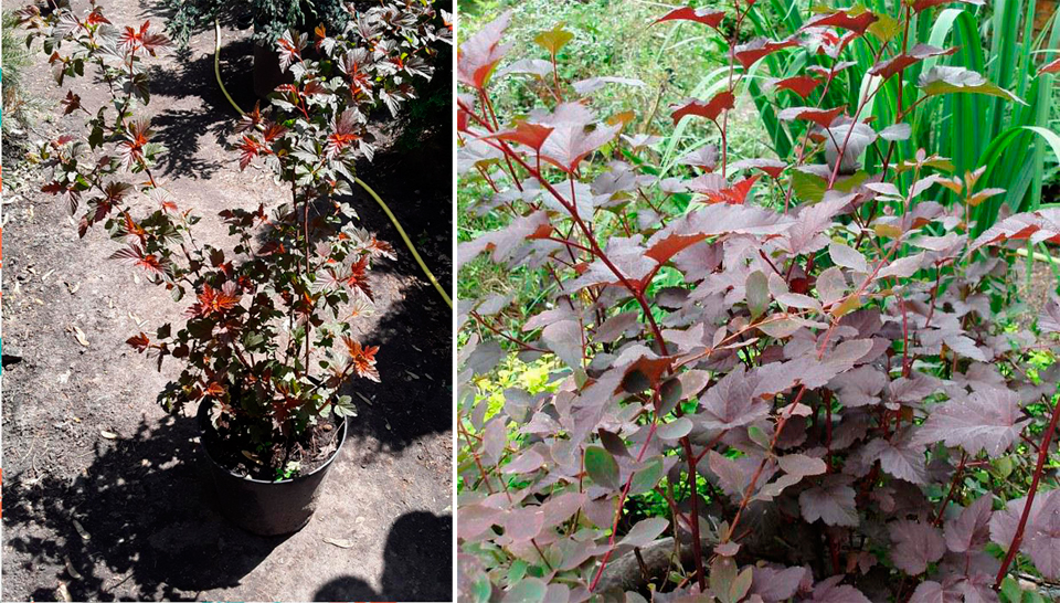 Данный сорт достигает минимальной высоты в 1,5 метра. Куст усеян большим количеством гофрированной листвы темно-красного цвета. Диаметр кроны в среднем два метра, размер скромный. Молодые отростки, завершение кроны, отличаются красным цветом. Цветовая палитра листвы зависит от контакта с солнцем. При частом контакте с ним листва приобретает красный цвет, в тенистой зоне они зеленый с оттенком красного. Растение выделяется быстрым ростом. При выращивании в декоративных целях необходимо регулярно проводить обрезку кроны.
