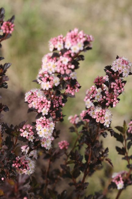 Пузыреплодник Schuch имеет листву красно-винного оттенка и цветет в конце весны бело-розовыми цветками.