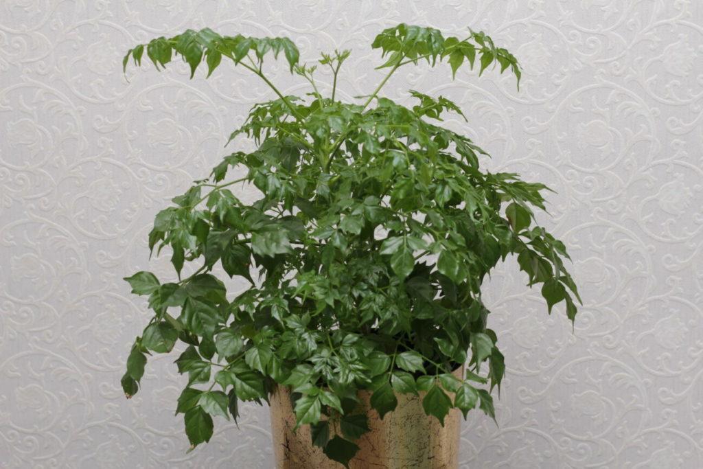 У растения пышная крона с крупными блестящими листьями насыщенного изумрудного цвета, разделёнными на несколько мелких сегментов.