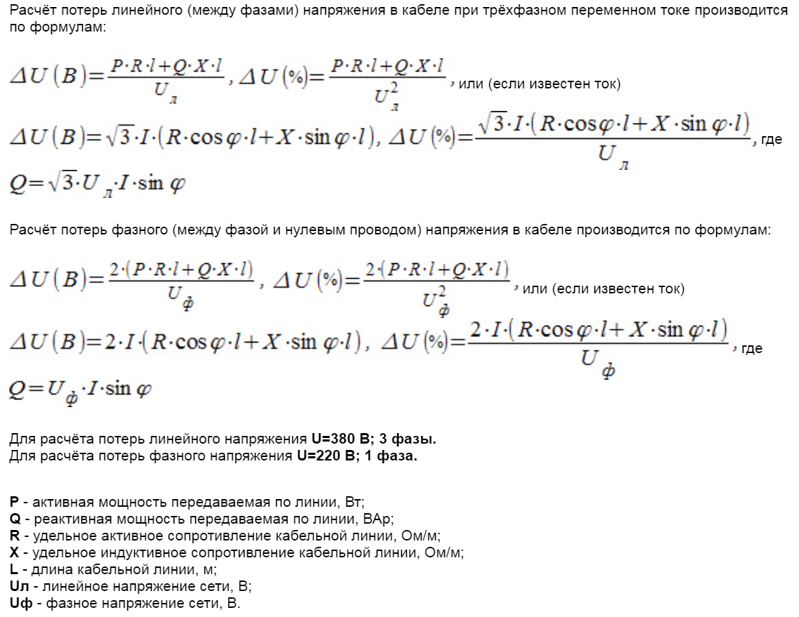 - U – потери напряжения в нагрузке (в самой удаленной точке линии, то есть по вычисленные максимуму);