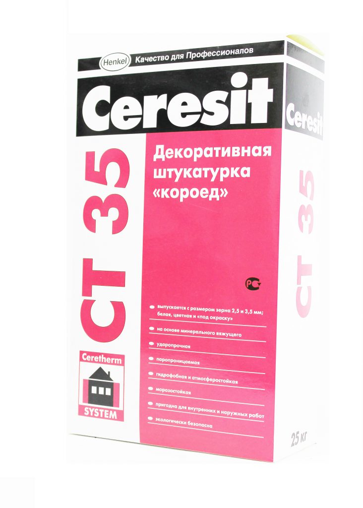 Полимерцементный CeresitCT-35 – продается в 25-килограммовых многослойных бумажных мешках в двух вариантах. Композитный порошок с зернистостью 2,5мм, согласно данных на упаковке, характеризуется материалозатратностью 3,2 кг/м².При частицах 3,5мм фасадная штукатурка короед расход на м2 будет иметь 4 кг.