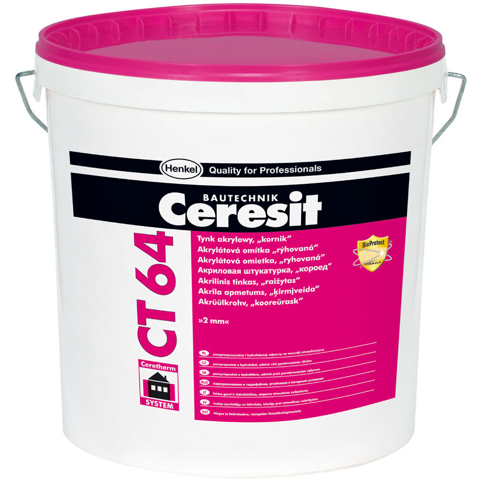 Акриловая паста немецкой компании CeresitCT-64 с зернистостью в 2мм фасуется в пластиковые ведра по 25 кг. Конечная величина затратности составит от 2,7 до 3кг/м², в зависимости от подготовки основания.