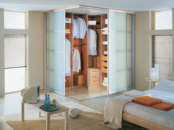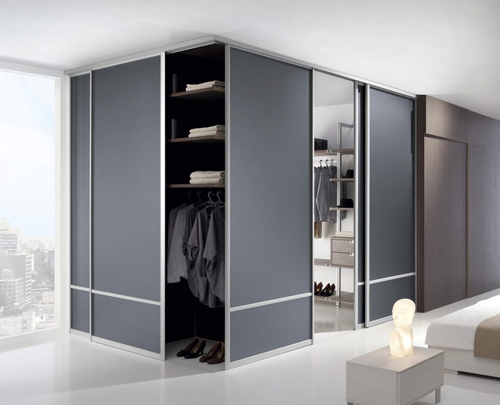 Угловая гардеробная может иметь две подвижные двери-купе, выполняющие также и функции стенок