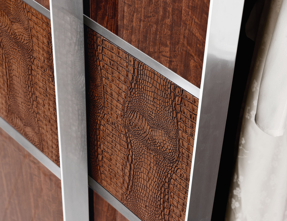 Самым классическим примером оформления раздвижных дверей является использование в качестве основного материала натуральной или искусственной древесины. Такие двери купе чаще всего производятся из ДСП или МДФ и сочетаются со всевозможными цветовыми решениями. Деревянные двери могут быть дополнены стеклянными или кожаными вставками.
