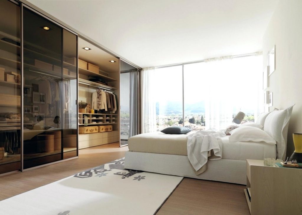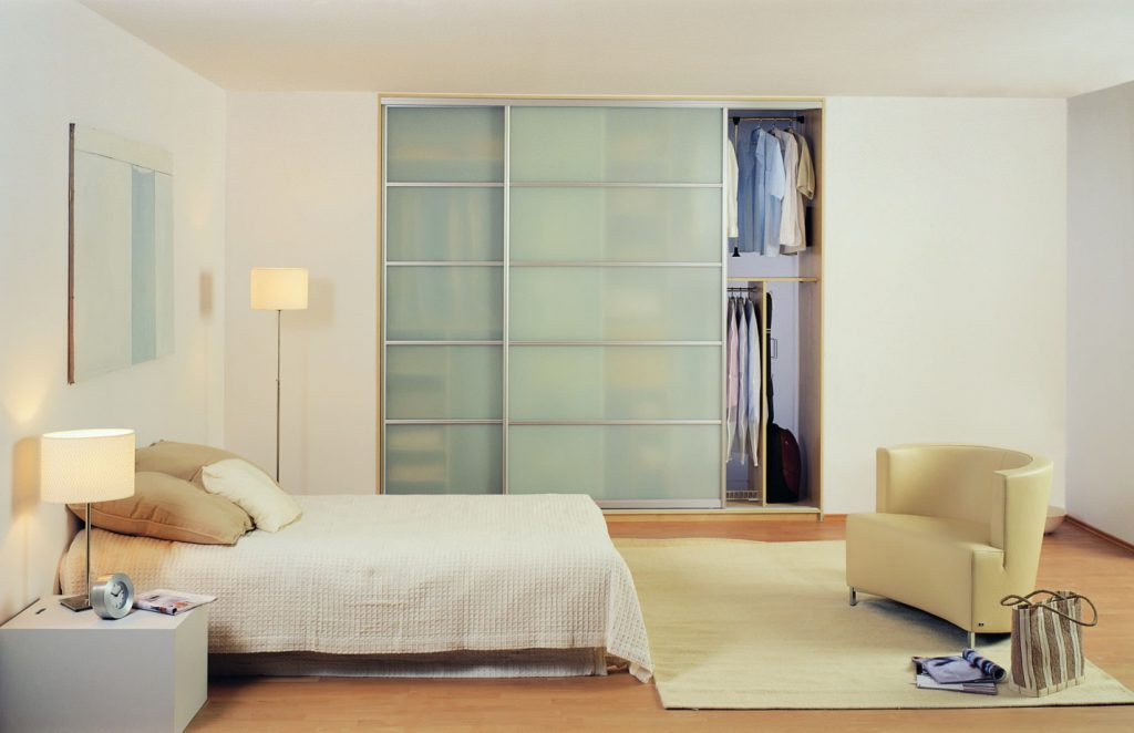 Зеркальные и стеклянные двери купе производятся из высокопрочного стекла и крепятся наподобие деревянного полотна. С обратной стороны стекло покрывается защитной пленкой – это необходимо в случае повреждения панелей. На фото вы можете увидеть вариант организации гардероба в спальне при помощи дверей из матового стекла и не только.
