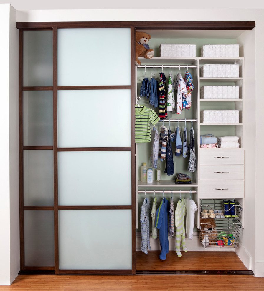 При организации шкафов небольших размеров создается специальная ниша либо раздвижные двери устанавливают в дверной проем на примере межкомнатных. В зависимости от свободной площади, под гардеробную выделяется целое помещение или участок комнаты. Для зонирования пространства в условиях недостатка свободного места используют зеркала, а также различные декоративные элементы в качестве дополнения к оформлению раздвижных дверей.