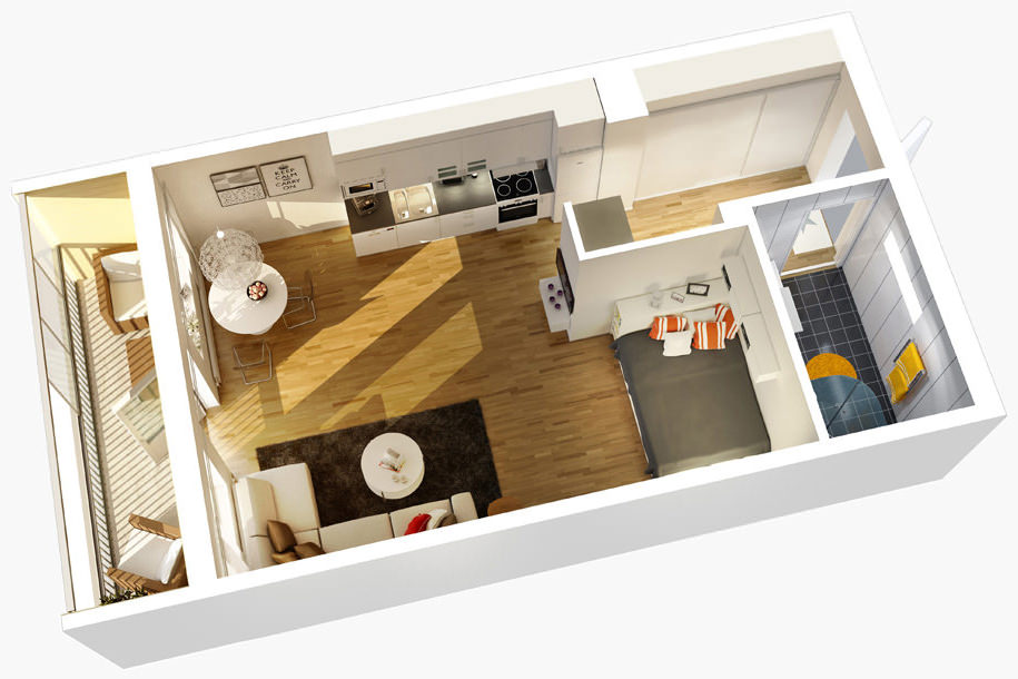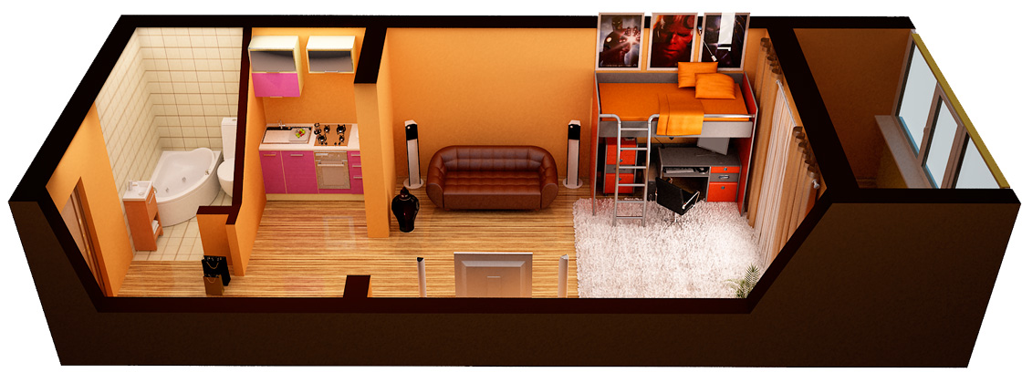 Это квартира, в которой изолирован только санузел: коридор переходит в единственную комнату с не отделенной перегородкой кухней. Студии стали все чаще появляться в современных постройках, как вариант бюджетного жилья. Они имеют увеличенную по сравнению с гостинками и малосемейками площадь и место для полноценного кухонного гарнитура. Однако не стоит путать студии с однокомнатными квартирами, в которых была снесена перегородка между комнатой и кухней: внешне они похоже, но студии обычно меньше площадью и запланированы такими самим застройщиком.