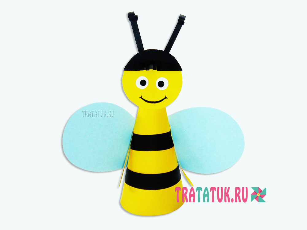 Яркая весенняя поделка для детей. В основном — очень простая, так как состоит из желтого конуса, головы с усиками и крыльев, которые сделать очень легко. Единственным затруднением могут быть полосы, так как их желательно вырезать в полукруглом варианте, чтобы впоследствии при приклеивании к конусу не возникло проблем.