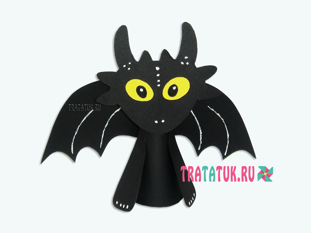 В продолжении черных персонажей, представляю вам симпатягу Беззубика из мультфильма «Как приручить дракона». Он также состоит из конусного туловища и дополняющих бумажных частей, для создания которых в помощь есть шаблон.