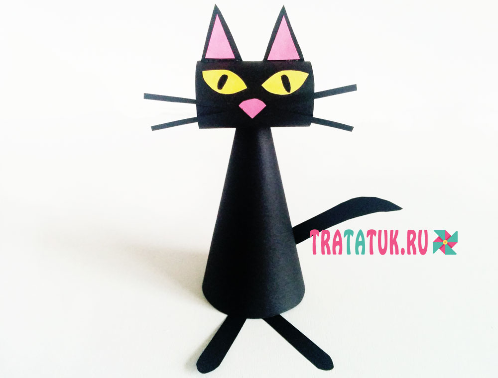 Простейшая поделка, состоит из черного конуса и цилиндрической небольшой головы, прикрепленной на вершине конуса. также понадобятся торчащие ушки, удлиненные глаза, нос, усы, лапы и хвост. Коты в этой технике смотрятся оригинально, красивы в различных расцветках.