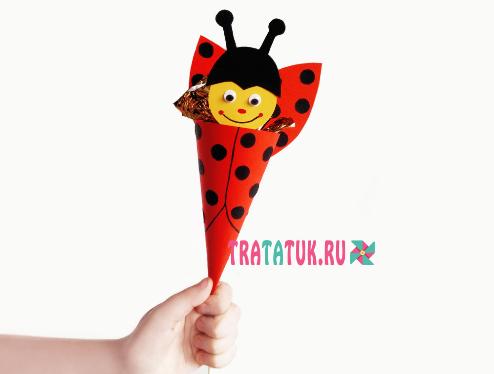 Скорее всего, это кулек-сюрприз в виде божьей коровки, с который можно положить сладости и презентовать такой подарок маме. Беря за основу конус, можно сделать такой сюрприз в виде самых разных персонажей.
