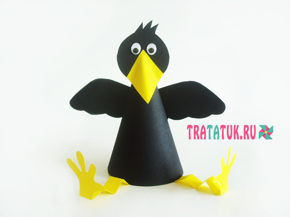 Из конуса можно сделать забавную ворону или вороненка. Причем работа очень простая. Основа – черный конус, крылья единым целым и голова в виде круга. А также понадобится из желтой бумаги широкий клюв и лапы в виде полос бумаги, сложенных в гармошку.