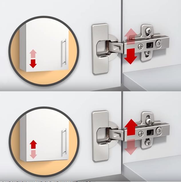 Вертикальная регулировка петель шкафа – действие, с которого следует начинать настройку мебельной фурнитуры. Такая настройка необходима в том случае, если дверь висит криво – выпирает из общего контура мебели, либо, если дверей две, одна располагается выше другой.