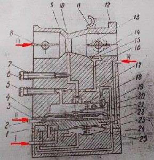 мембрана насоса-22, корпус-23, крышка насоса-24, полость подкачивающего насоса-25. Обозначение стрелками на принципиальной схеме: