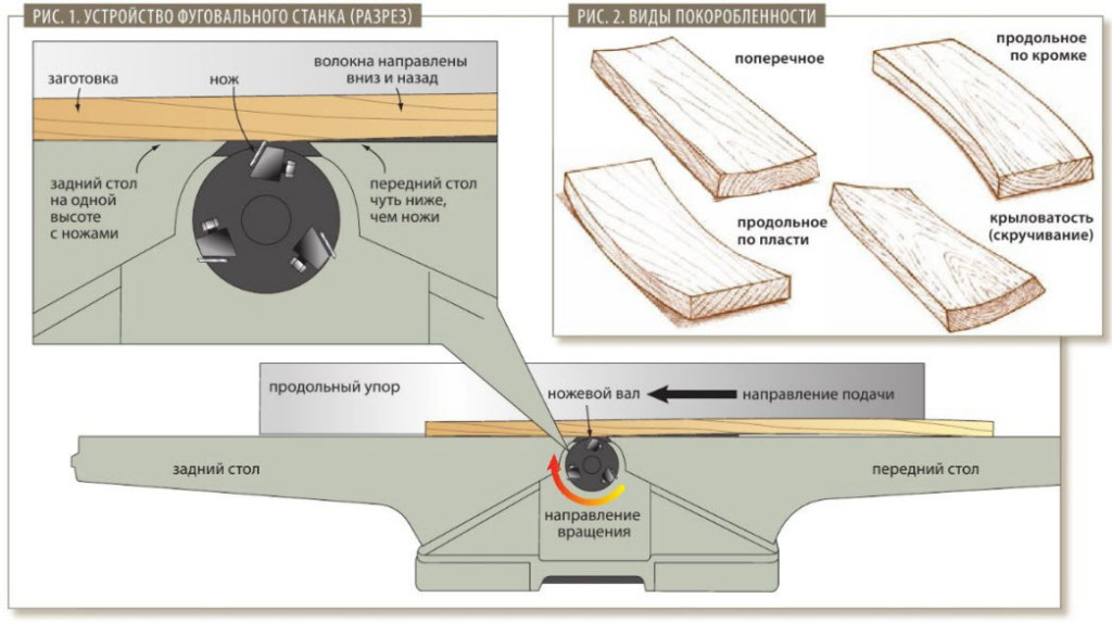Перед фугованием взгляните вдоль кромки доски, чтобы проверить, нет ли продольного изгиба или коробления (рис. 2), а также, чтобы определить направление волокон. Для получения наилучших результатов строгайте покоробленную доску так, чтобы ее выпуклая сторона была обращена вверх (иными словами, доска должна опираться на ее края), а волокна были направлены вниз и назад (рис. 1). Если волокна будут направлены вверх, движущиеся ножи станут отрывать волокна, что приведет к скалыванию небольших кусочков заготовки (так называемым вырывам). Чтобы отфуговать пласть доски, настройте передний стол на глубину реза не более 1,6 мм. Положите доску на передний стол перед ножевым валом. Пользуясь толкателями, подавайте доску вперед. Направленное вниз усилие прижима должно обеспечивать только контакт доски с передним столом, но не более того (фото А). Чрезмерное прижимное усилие может распрямить продольную или поперечную покоробленность, и после ослабления прижима доска примет прежнюю форму.