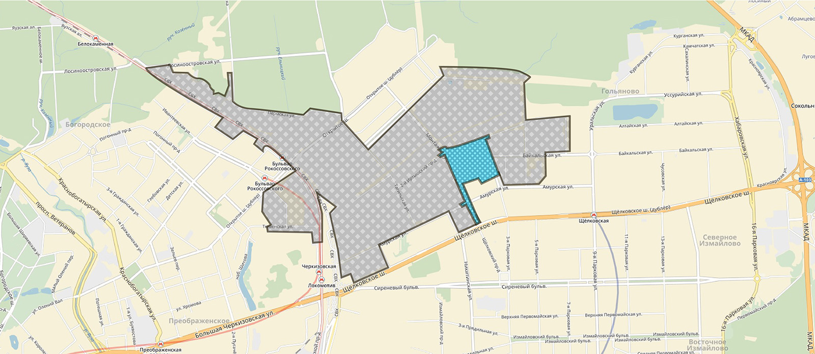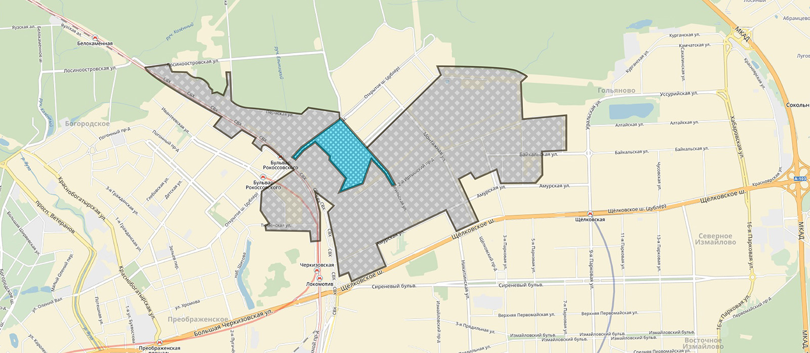 На участке, ограниченном Тагильской улицей, Открытым шоссе, проектируемым проездом № 2277 и 6-м проездом Подбельского, сейчас располагаются объекты промышленно-производственного, складского и коммунального хозяйства. Площадь территории – 37,6 га.