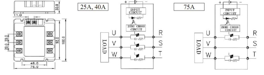 - Трехфазные (серии TSR) — TSR-25DA, TSR-40DA, TSR-75DA, TSR-25A, TSR-40AA, TSR-75AA.