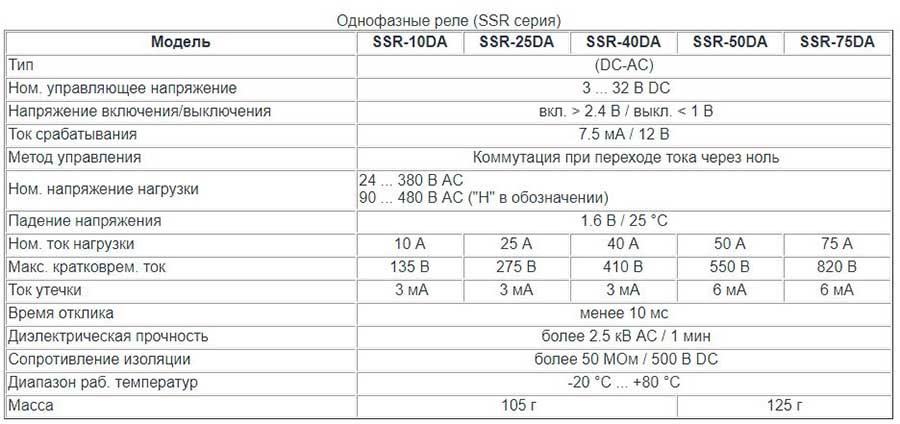 - Однофазные (серии SSR) — SSR-10DA, SSR-25DA, SSR-40DA, SSR-50DA, SSR-75DA.