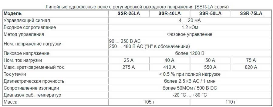 - Линейные однофазные с регулировкой выходного напряжения (SSR-LA серия) — SSR-25LA, SSR-40LA, SSR-50LA, SSR-75LA.