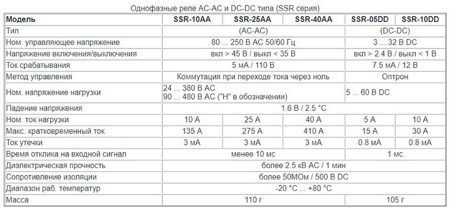 - Однофазные AC-AC и DC-DC типа (SSR серия) — SSR-10AA, SSR-25AA, SSR-40AA, SSR-05DD, SSR-10DD.