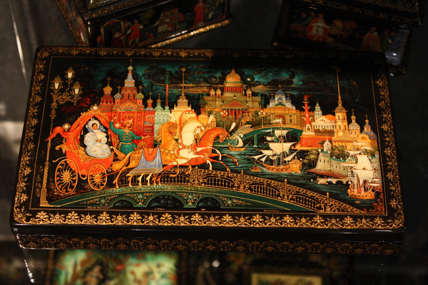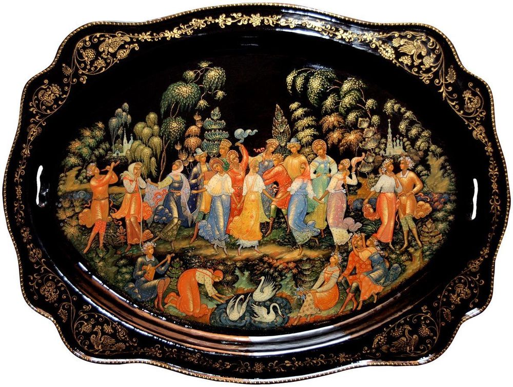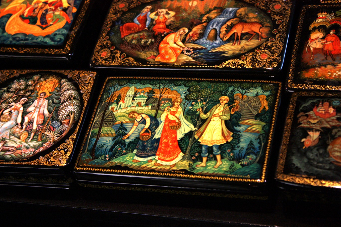 Палехская миниатюра (по названию райцентра в Ивановской области) – так называется живопись на лаковых изделиях из папье-маше. Шкатулки и ларцы с бытовыми фольклорными, литературными, историческими, религиозными сюжетами, выполненными яркими красками по черному фону. Искусство палехской лаковой миниатюры восходит к XV веку. Первоначально художники писали иконы. Старинная технология росписи передается из поколения в поколение.