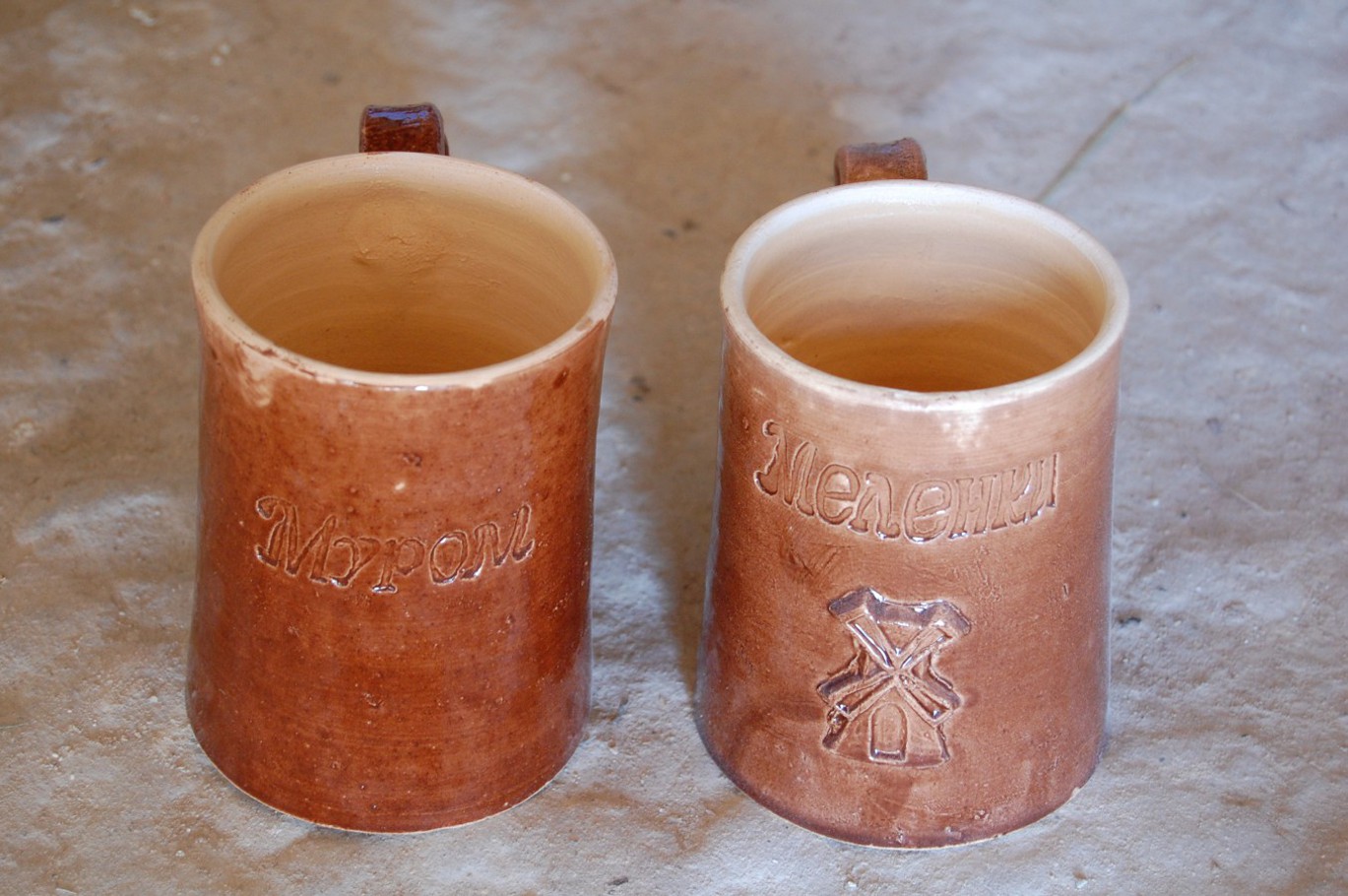 Меленковская керамика. Пивные кружки, изготовленные в мастерской Малаховых из с. Коровино Меленковского района Владимирской области. Фото А.Г. Кулешова. 2010