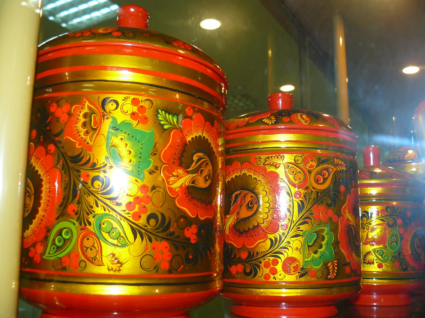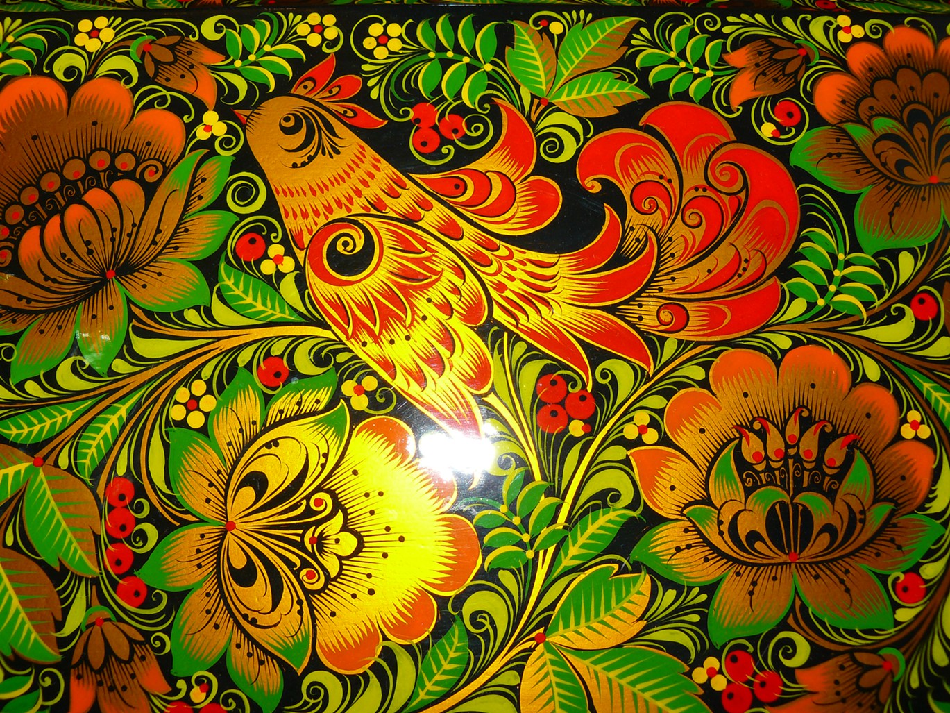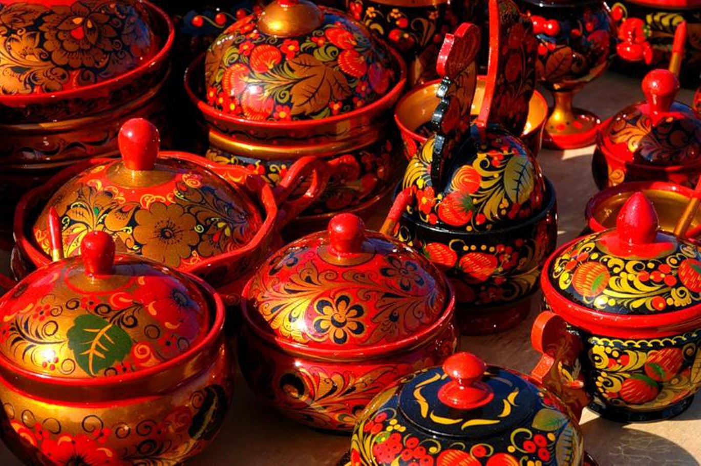 Хохлома – это ручная роспись по дереву. Этому промыслу более 300 лет. Чашки, солонки, стулья, полки – расписаны диковинными огненно-алыми цветами. Секрет этих изделий в том, что их два-три раза покрывают лаком, а потом закаляют в печи. От этого лак желтеет, и деревянные расписные чашки становятся похожими на драгоценную позолоченную посуду.