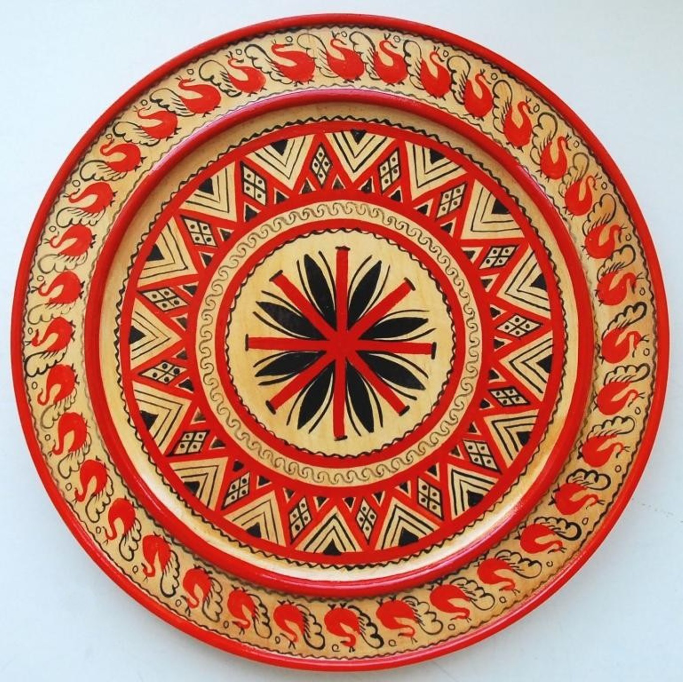 Подготовленную посуду мезенские мастера расписывали охрой по чистому негрунтованному дереву с помощью особой деревянной палочки — тиски. Пером глухаря или тетерева делали черную обводку, а потом уже наносили красные и черные узоры кисточкой. Мастер делил рисунок на три части: небо, землю и подземный мир. Их границы он обозначал прямой линией, узоры располагал в строгом порядке. Главными элементами росписи были животные и птицы: конь, олень и утка. Обрамляли рисунки геометрические орнаменты из прямоугольников и ромбов, дисков и решеток.