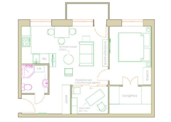 При этом трансформируются перегородки между жилой комнатой и смежными помещениями – кухней и прихожей (коридором).