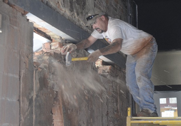 Когда хотя бы на одной стороне межкомнатной стены можно будет различить кирпичные ряды и швы между ними, тогда в патроне перфоратора насадку «широкую стамеску» заменяют на «зубило». В принципе, эти две насадки схожи, однако «зубило» предназначено для тяжелого грубого долбления, а «широкая стамеска» больше для очистки поверхности. Используя ударную силу перфоратора и установив лезвие зубила в область горизонтального кирпичного шва, производят поэтапное отделение кирпичей из кирпичной кладки.