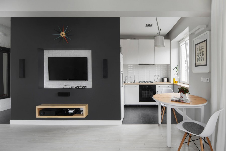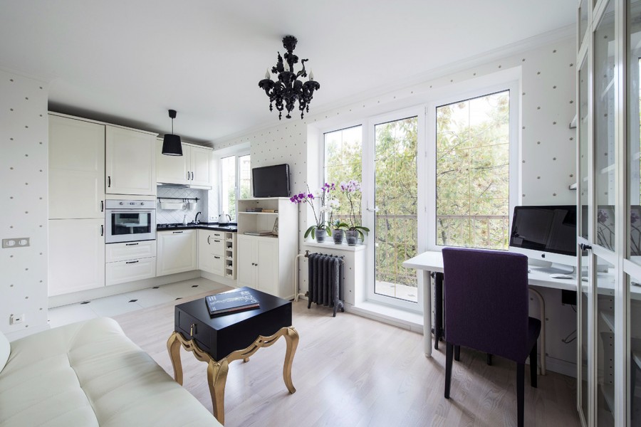 Минусом могут стать небольшие рабочие зоны кабинета и кухни, а также маловместительная за счет организации гардероба спальня.