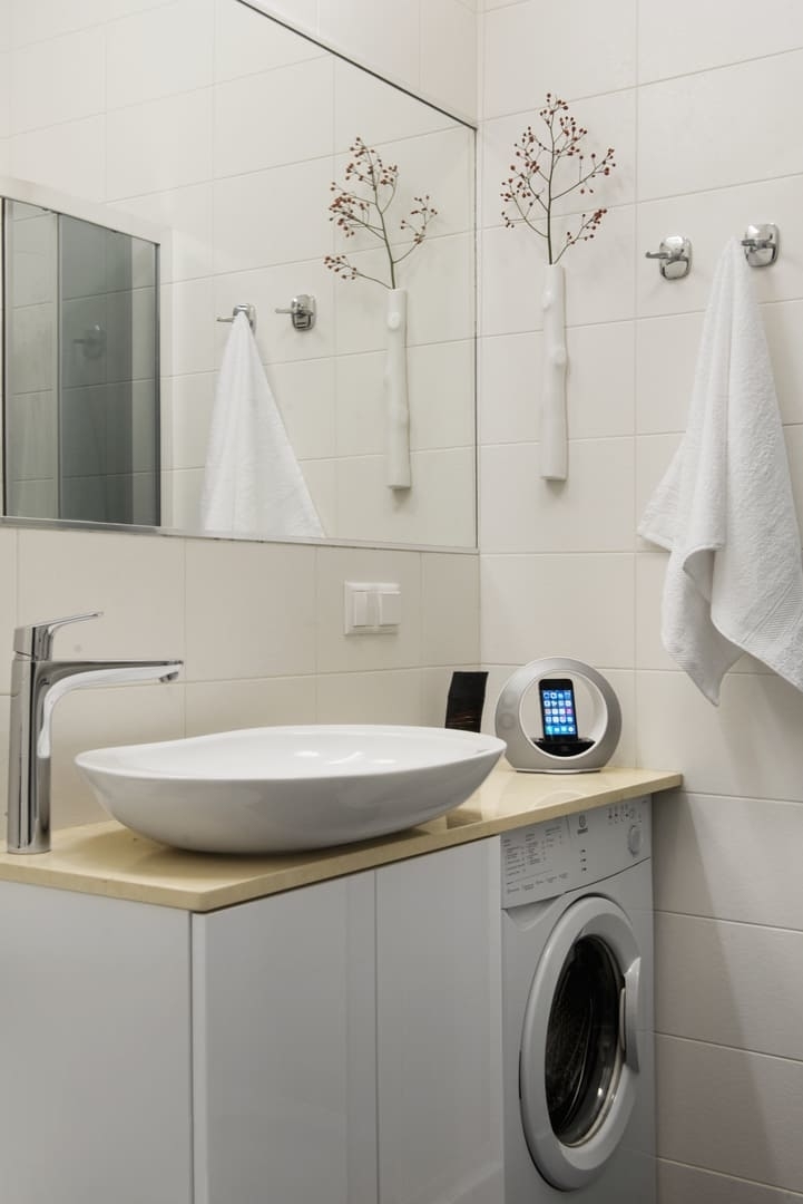 Дизайн ванной не имеет смысла если в ней будет беспорядок. А в хрущевке всегда проблема с местами для хранения вещей. Особенно это актуально если под раковиной у вас стоит стиральная машина вместо тумбы. Решение — узкий навесной шкафчик. Место для него можно найти почти всегда. Лучше всего смотрится в белом глянце.