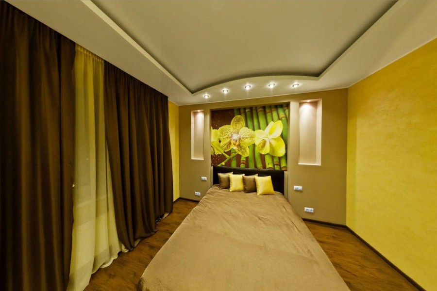 При оформлении спальной комнаты используйте не больше трех оттенков. Это касается стен, потолка и пола. Для большего визуального увеличения комнаты, используйте светлые тона.