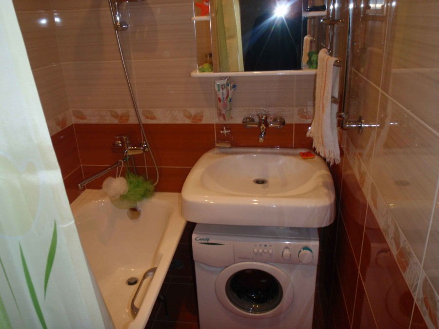 Для хрущевки где ванная объединена с туалетом, есть варианты и с отдельностоящей стиральной машиной, но выглядит это почти всегда плохо. Даже в этом варианте лучше встроить под раковину, а в освободившемся месте сделать шкаф.