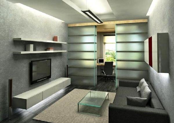 Разбивая высвободившуюся площадь на рабочие зоны, можно оборудовать небольшой рабочий кабинет, который отделен от зоны отдыха любым приемом с применением перегородок. Как правило, в таких случаях дизайнеры работают с прозрачными перегородками, в которых может разместиться аквариум. Но это дело вкуса каждого домовладельца. Возможен вариант применения раздвижных перегородок.