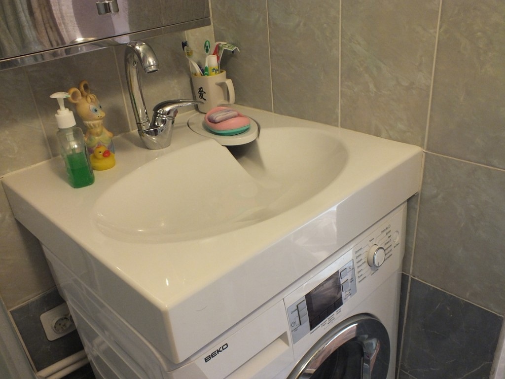 Под широкой раковиной или умывальником машинка тоже не мешает: