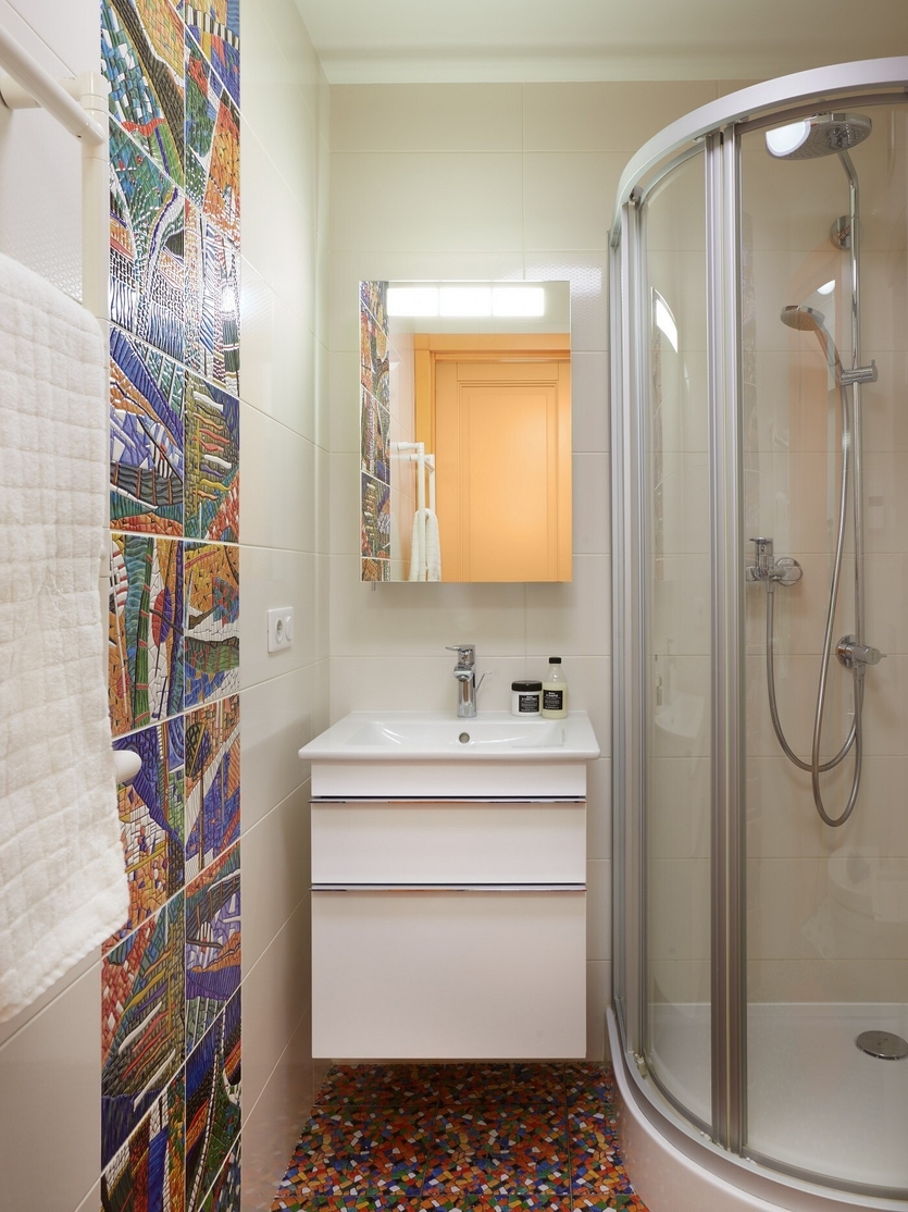 Отделка стен ванной комнаты выполнена из керамической плитки разных цветов