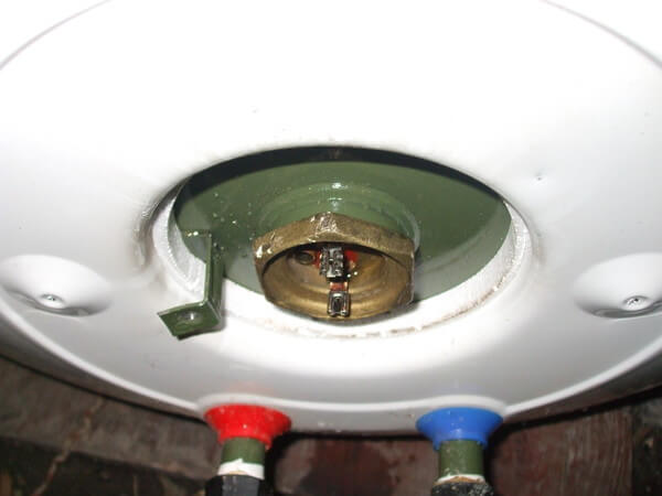 Если Вам нужно выполнить разборку водонагревательного бака, у которого снизу нагревательный элемент закреплен большой шестигранной гайкой, как на фото ниже, сделать Вы все сможете быстро.