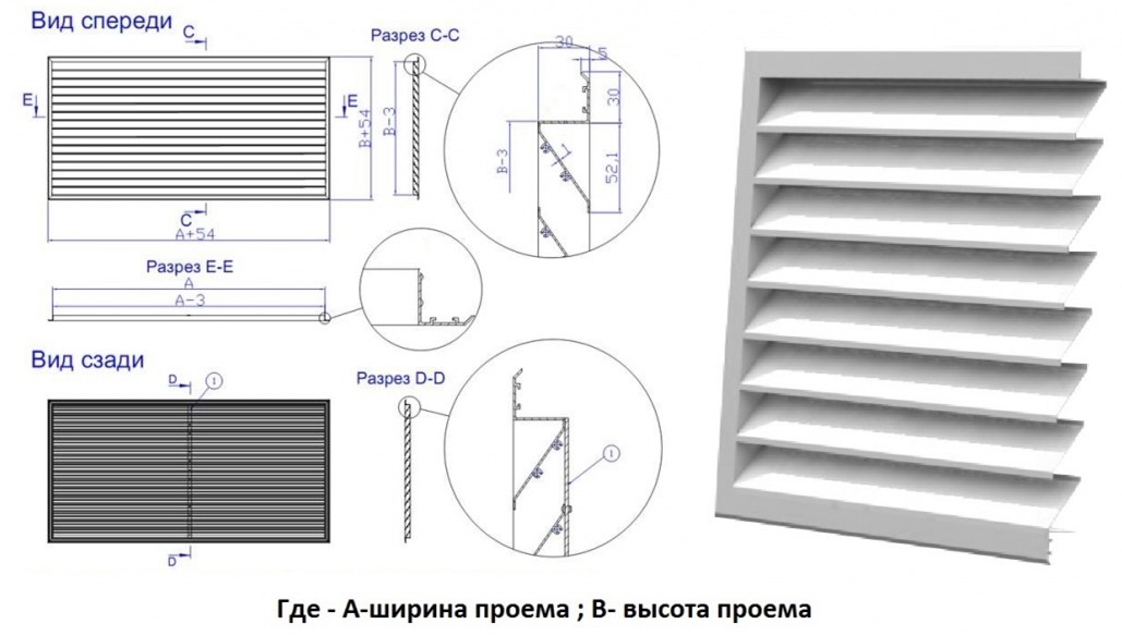 Их монтаж выполняется с улицы. За счет их установки предотвращается попадания дождя, снега, птиц, пыли и тому подобного в воздуховоды. Как правило, такие решетки имеют сетку. Изделия такого плана преимущественно изготавливаются из алюминиевого сплава. Имеющийся алюминиевый профиль оборудуется специальной жалюзей, которая устанавливается под нужным углом. Для их монтажа используются дюбеля и болты.