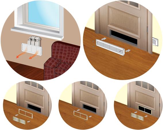 Они нужны для того, чтобы обеспечивать свободное перемещение воздуха из комнаты в комнату. Монтируются такие решетки в нижней части стены или дверей. В качестве материала для решеток, находящихся в помещении, выбирают пластик.