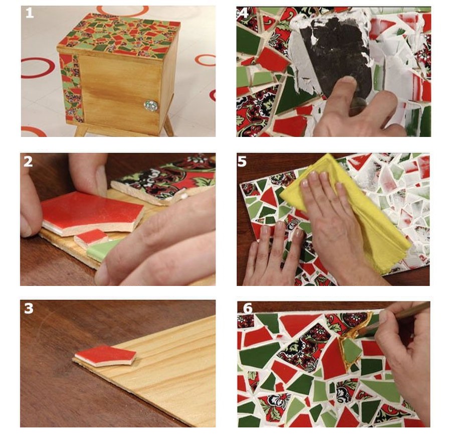 Плиточным клеем сначала выкладываем рамочные элементы мозаики. Стараемся делать максимально одинаковые швы. Затем с центра стола начинаем выкладывать плитку (или кусочки плитки). Интересным решением будет укладка плитки разных цветов.