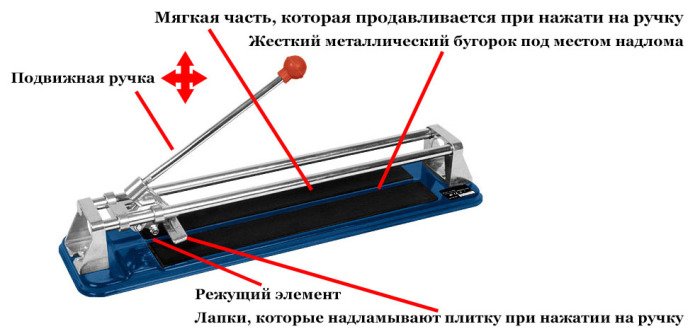 Плиткорез работает по одному принципу со стеклорезом — ролик разрезает плиточную глазурь, когда сам элемент плотно зажат в корпусе. После того как выполнен разрез, плитку просто отламывают аккуратно по этой линии. Ручным плиткорезом можно выполнить и круглые отверстия.