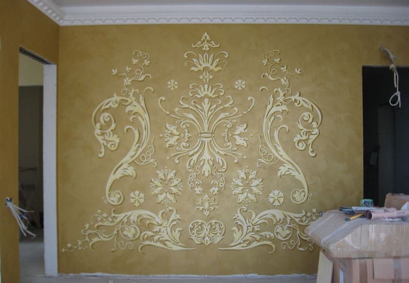На стену узор можно наносить при помощи трафарета. Подобная техника предоставляет широкий простор для фантазии, дает возможность играть на контрасте цветов. Этот тип украшения стен подходит для мелкого формата и монохромного рисунка. Трафарет можно купить либо самостоятельно подготовить контур на принтере, который потом переводится на плотный картон.