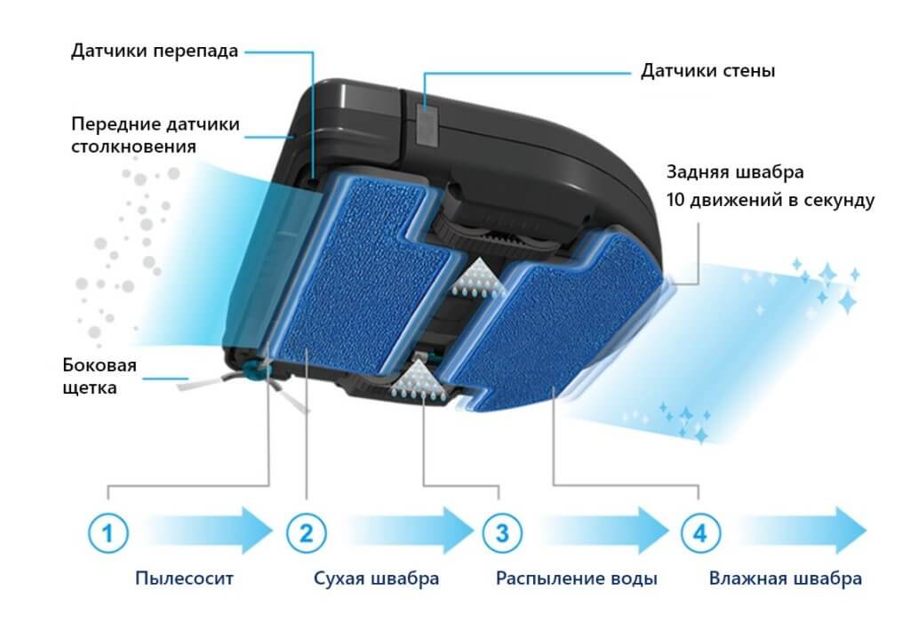 Про второй момент хотелось бы больше объяснить. Дело в том, что полотеры с тряпочкой, закрепленной на днище, передвигаются на колесах, поэтому корпус, как и сама микрофибра, не так плотно прижимается к полу. В результате робот-полотер не оттирает грязь, а именно протирает.
