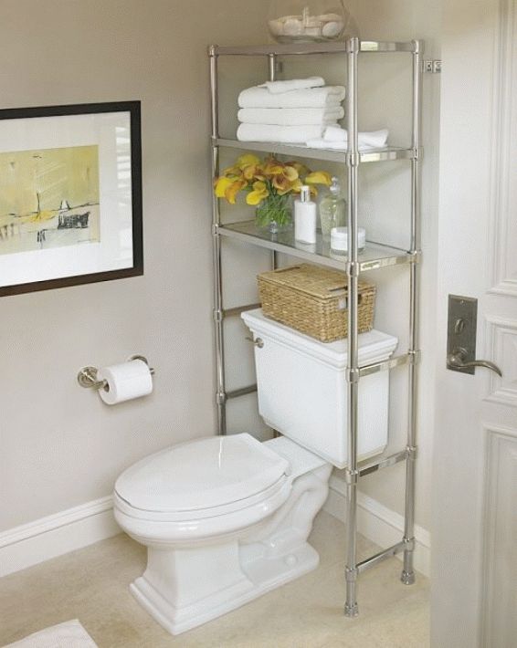 Металлический стеллаж компактен, для такой конструкции неважна модель унитаза. На стеклянных полочках хранят декор и хозяйственные предметы.
