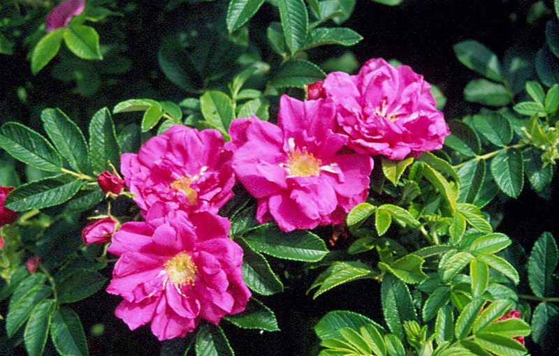 - Роза цвета фуксии Rosa Rugosa Scarbosa растет высотой до двух метров. Цветы очень ароматные, плоды очень крупные. Цветет обильно и продолжительно – от весны до самой осени.