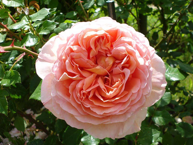 Высота куста 160-200 см. Высокий, пышный кустцветет рыхлыми махровыми цветками, окраска которых сильно варьирует от нежно-абрикосовой до розовой, в зависимости от времени года и типа почвы.