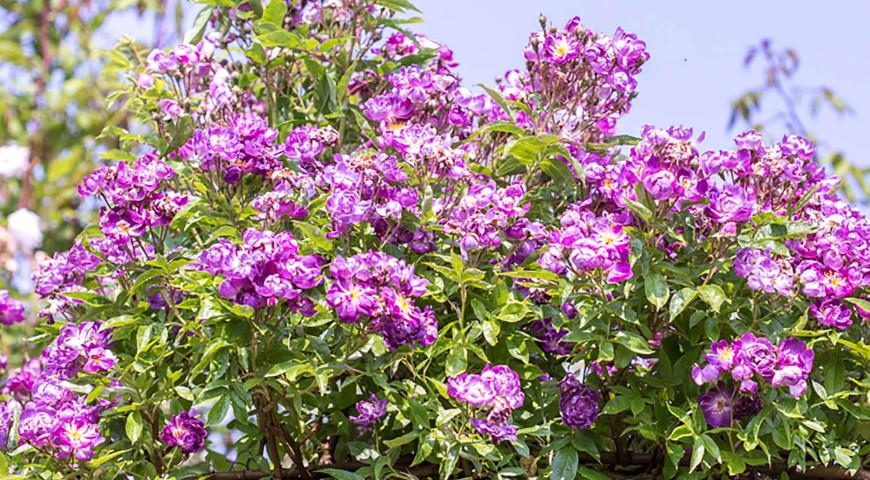 Пурпурный рамблер, до 200 см высотой. Цветы не выгорают. Цветение однократное, умеренное.