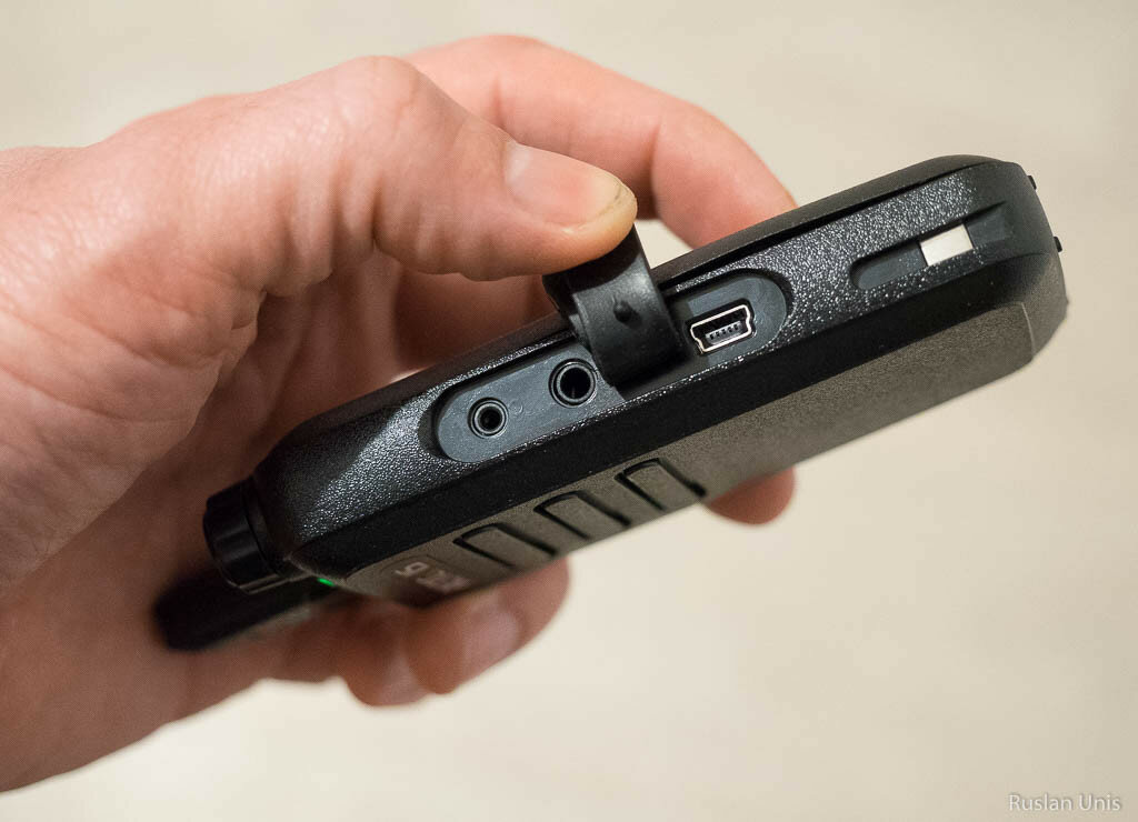Справа сдвоенный разъем для гарнитур и тангент, под ним разъем miniUSB для зарядки, все разъемы закрыты резиновыми заглушками, которые нужно отодвинуть в сторону для подключения.