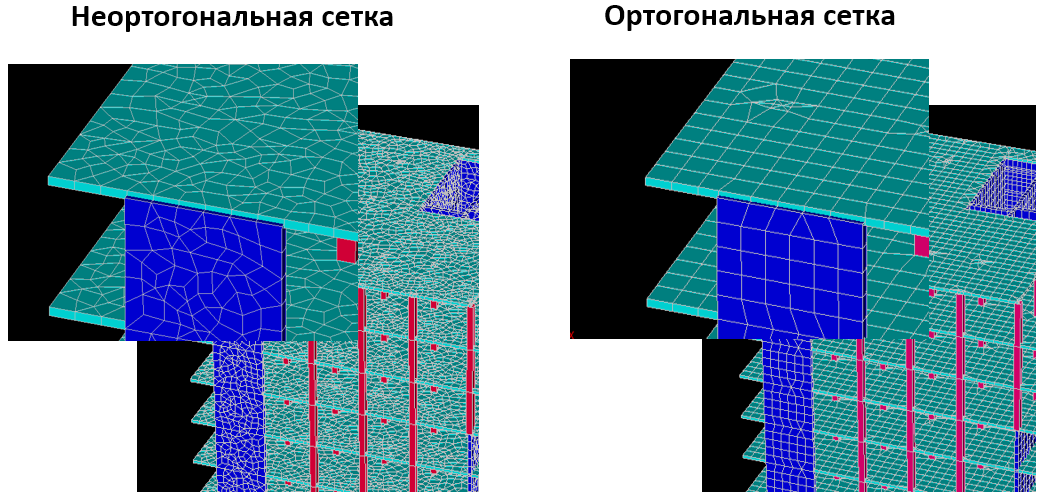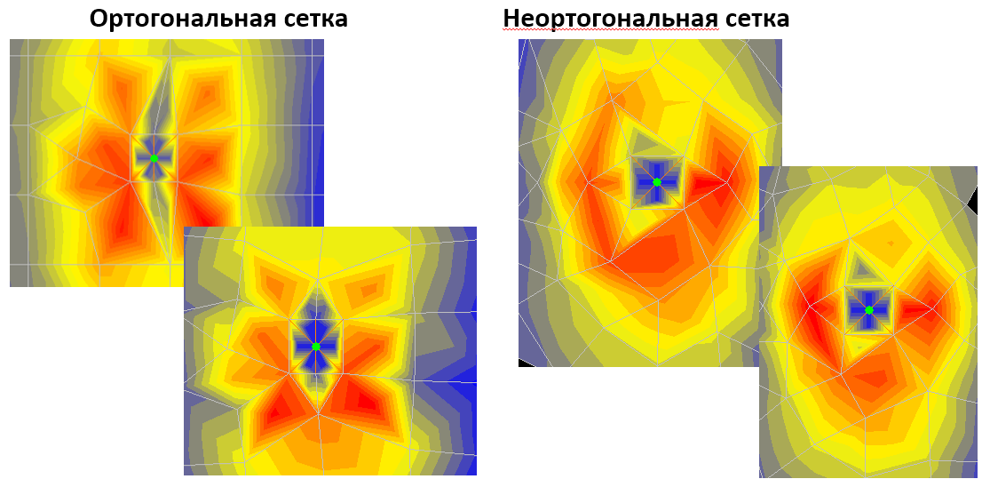 Модель была дважды разбита на конечные элементы с ручным выделением каждого контура. Первый способ – “В. С разбиением контура” – для получения неортогональной “треугольной” сетки, второй – “Создание ортогональной сетки с заданным максимальным размером элемента” – для создания “старой” ортогональной сетки. Далее будем называть эти сетки просто “ортогональная” и “неортогональная”.